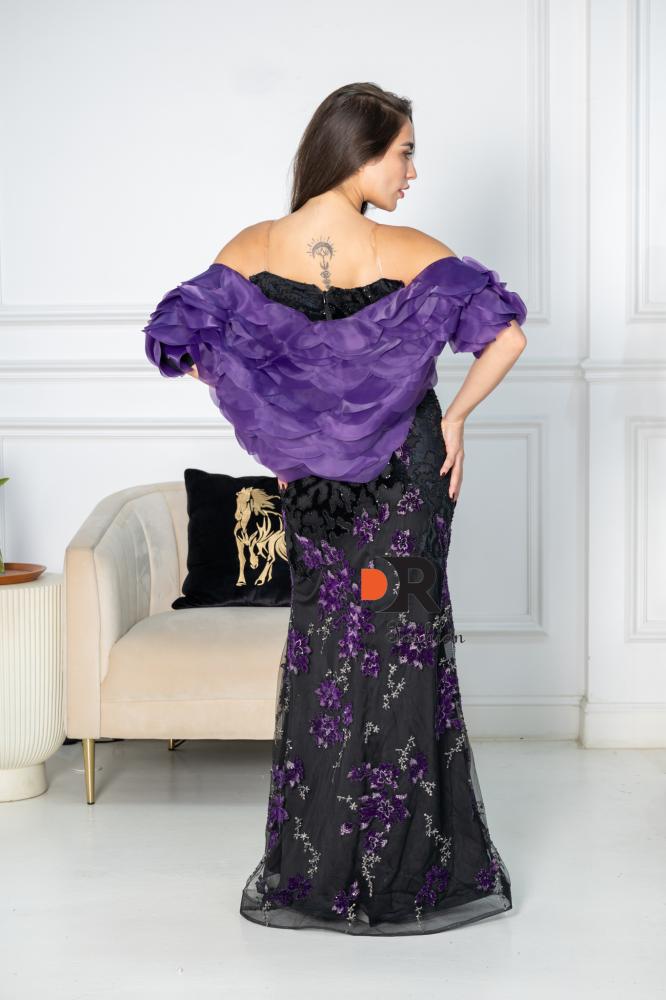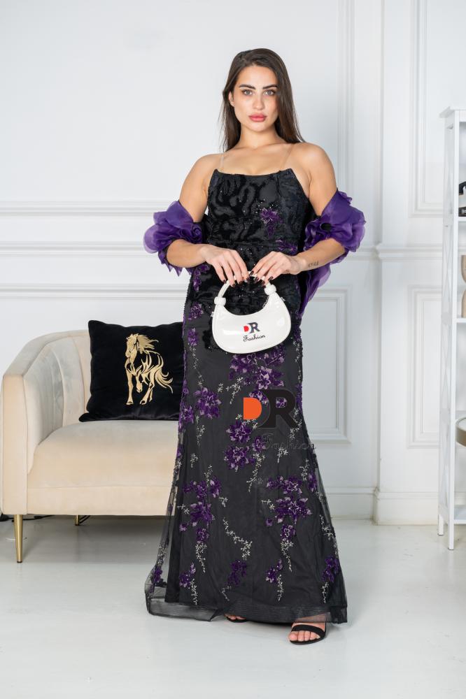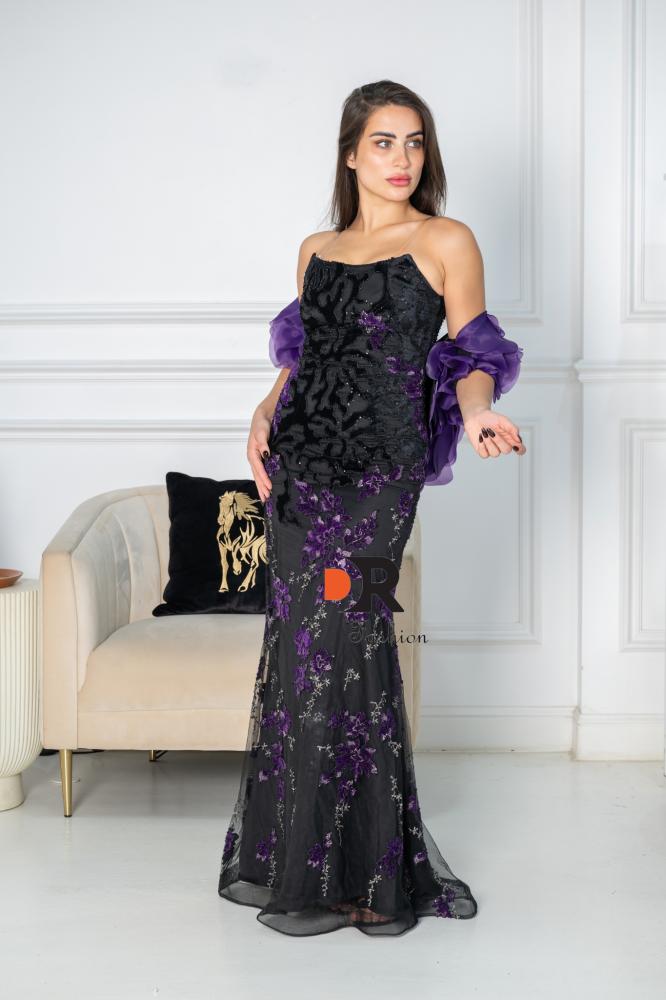 فستان سهرة طويل بلون الاسود مع تدخيله عنابي ، يتميز بتصميم أنيق ومطرز.
