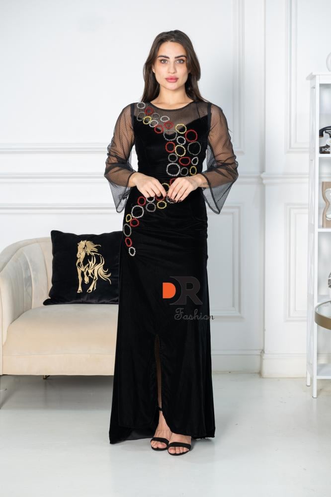 فستان سهرة طويل بلون الاسود، يتميز بتصميم أنيق ومطرز.