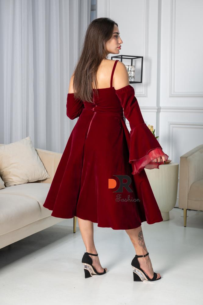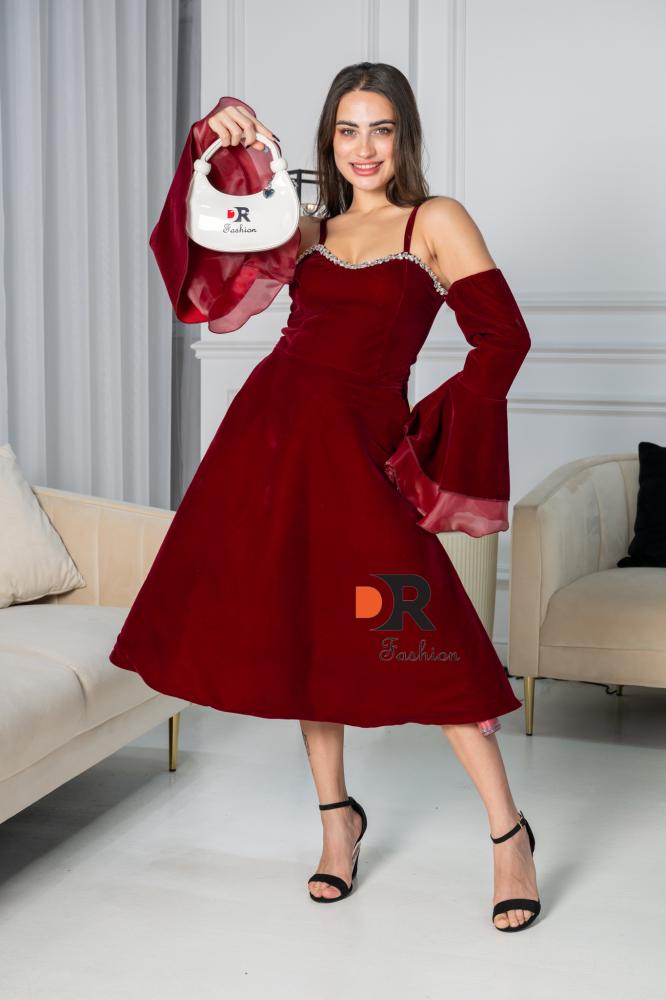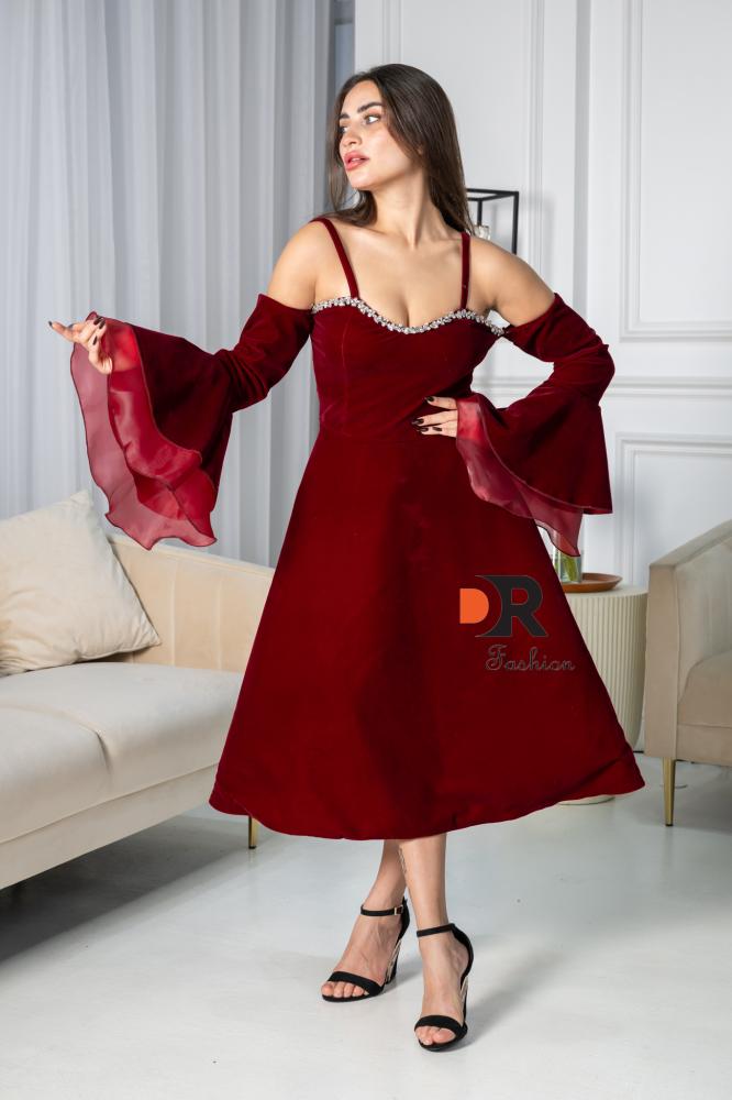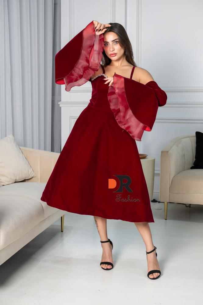 فستان سهرة ميد بلون احمر، يتميز بتصميم أنيق ومطرز.